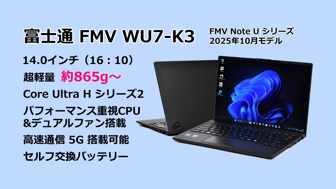 富士通 FMV WU7-K3 (2025年10月モデル) は、インテル Core Ultra H プロセッサー(シリーズ2)を搭載した 14.0型モバイルノートPC です。