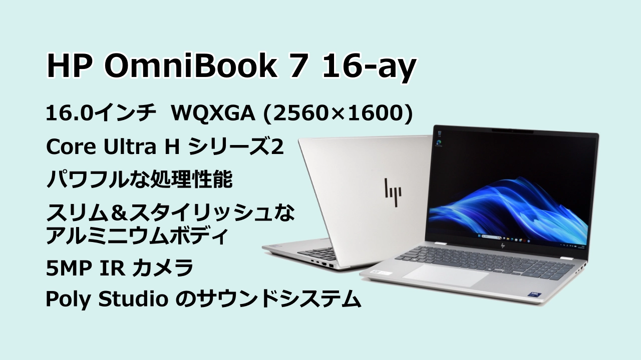 日本HPが販売する HP OmniBook 7 16-ay は、インテル Core Ultra H プロセッサー(シリーズ2) を搭載した 16型ノートパソコンです。